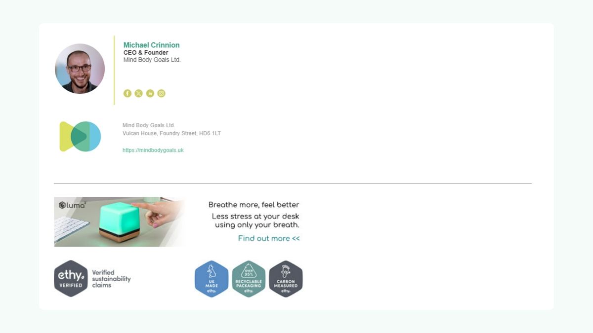 Transform everyday communication into a sustainability statement by adding ecolabels to your business email signatures. This not only reinforces your commitment to responsible practices but also sparks curiosity among recipients. It's an unobtrusive yet effective way to promote sustainability values, potentially leading to fruitful partnerships or collaborations with like-minded stakeholders. Moreover, it's a handy means of engaging your wider team in your sustainability journey and empowering them to shout about their achievements.