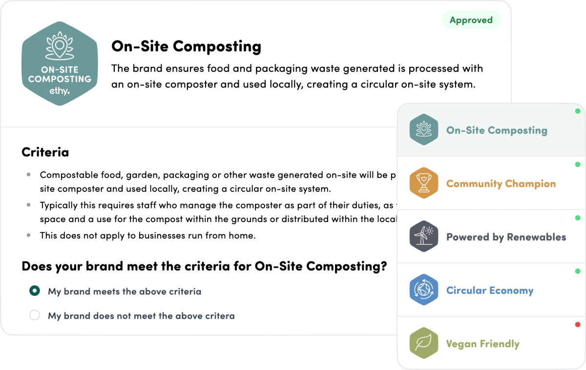 Recognising time and resource constraints faced by many small businesses, lots of them can't (or don't want to) wait for the 6-10 month B Corp review process. In contrast, ethy's assessment process is much quicker, taking just two weeks on average. We've developed a user-friendly digital platform for assessment, and businesses can decide how many sustainability standards they want to apply for, with the option to apply for more later at no extra cost. To further expedite the process, ethy assigns a dedicated account manager to guide businesses through the application, ensuring a swift certification experience.