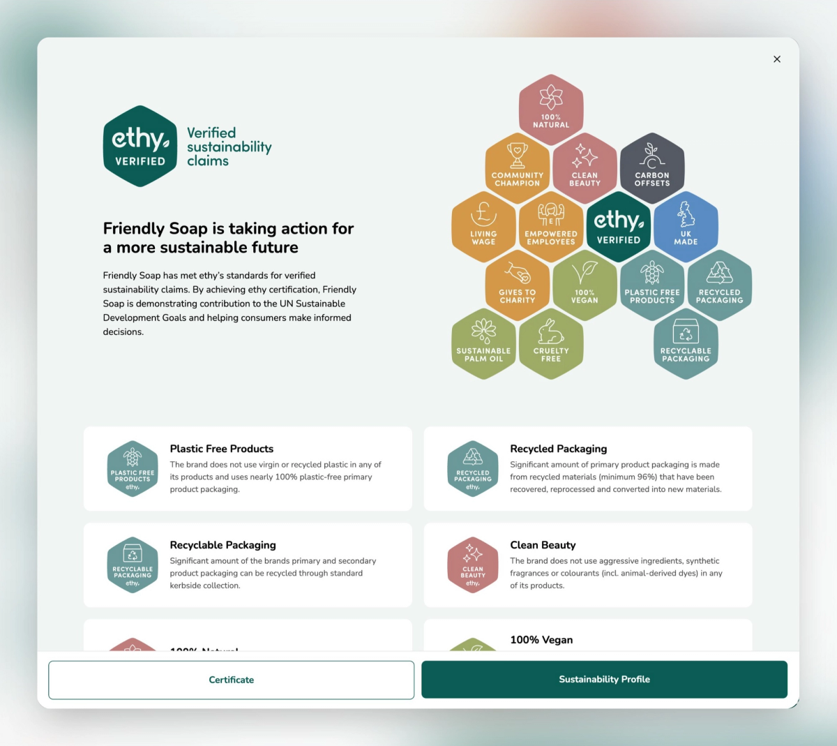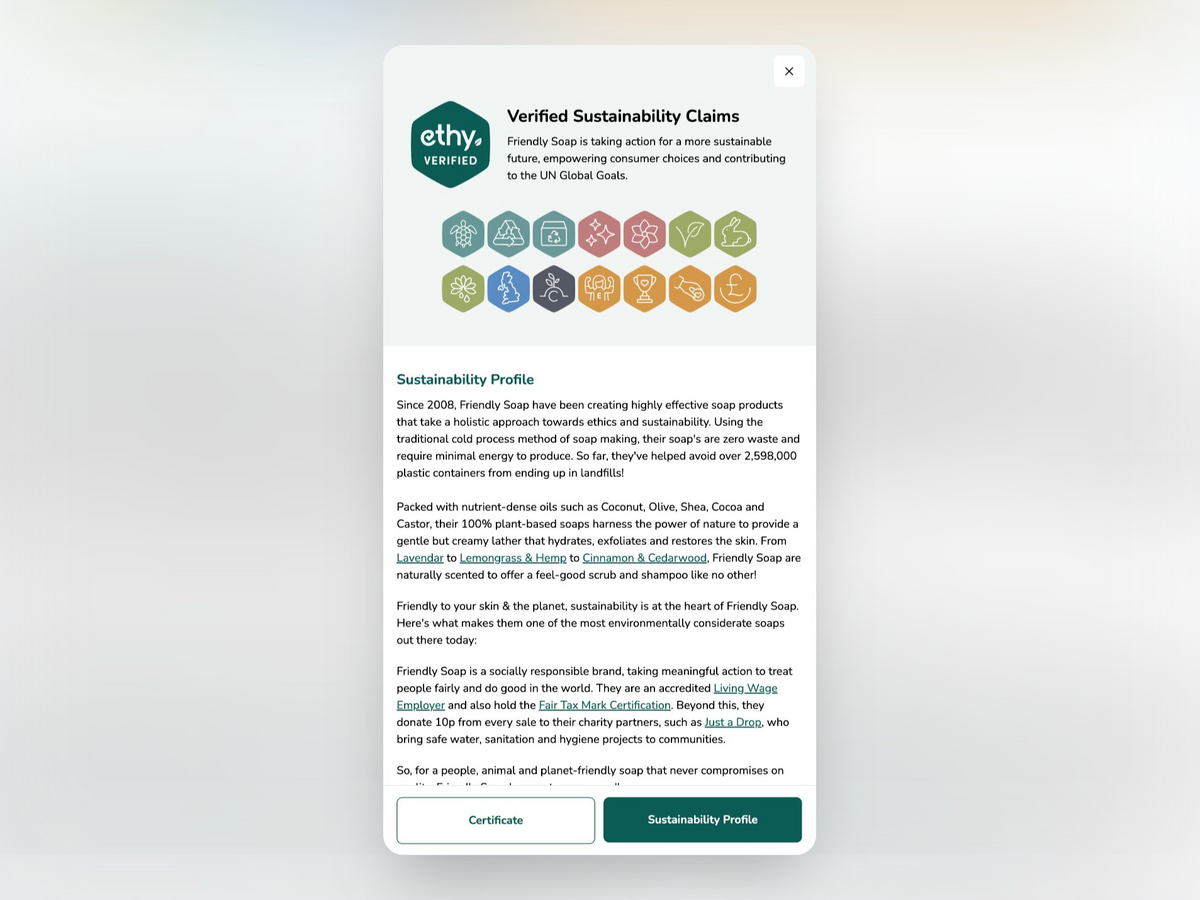 At ethy, we understand the importance of transparency and trust regarding sustainability claims. That's why we've recently launched a new set of embeddable widgets that allow you to easily showcase your ethy verified status and ecolabels on your website. Whether you want to highlight your sustainability initiatives on your homepage, product pages, sustainability page, footer or anywhere else on your website, our widgets make it easy.